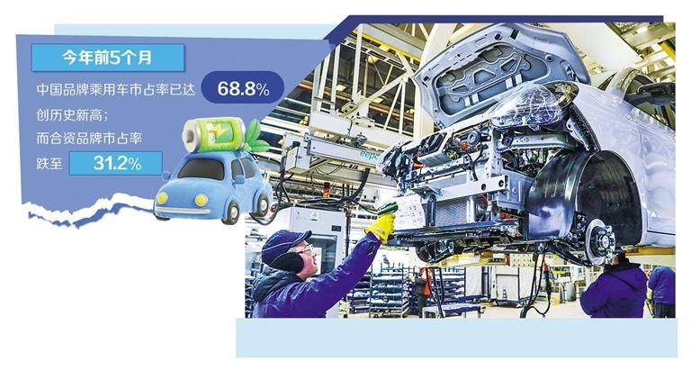 電動(dòng)化與智能化變革浪潮,不僅在加速汽車產(chǎn)品進(jìn)化,也在深刻重構(gòu)市場(chǎng)競(jìng)爭(zhēng)格局。中汽協(xié)數(shù)據(jù)顯示,今年前5個(gè)月,中國(guó)品牌乘用車市占率已達(dá)68.8%,創(chuàng)歷史新高;而合資品牌市占率跌至31.2%,創(chuàng)出新低。