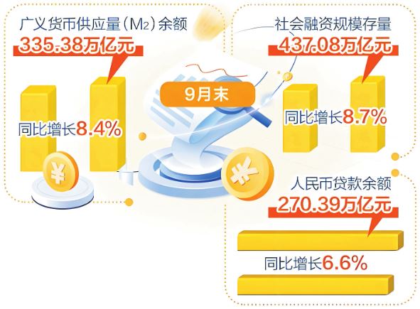 9月末,M2余額335.38萬億元,同比增長8.4%,在上年同期高基數(shù)背景下,仍保持較高增速;社會融資規(guī)模存量437.08萬億元,同比增長8.7%,比上年同期高0.7個百分點(diǎn);前三季度,社會融資規(guī)模增量累計(jì)為30.09萬億元,同比多增4.42萬億元。