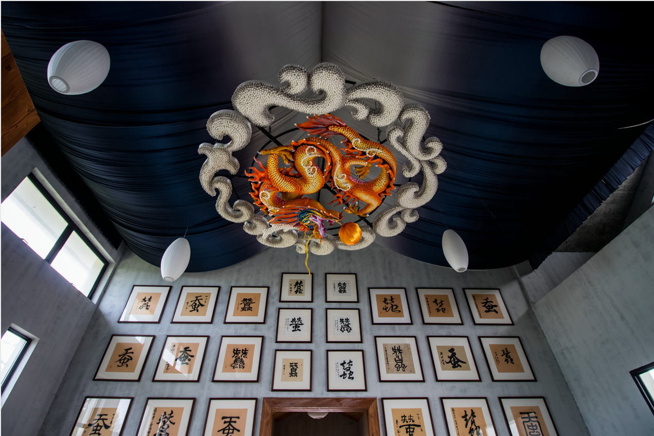 走入云龍村的云龍記憶館,縱使見多識(shí)廣,全國主流媒體記者們也依然被盤旋于頂?shù)拇T大金龍震撼到了,紛紛掏出手機(jī)拍個(gè)不停:這條金龍是用15000多個(gè)蠶繭制作而成,外圍是蠶繭組成的祥云,包裹著里面的金龍,這是云龍村的象征。
