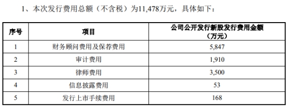 本次發(fā)行費(fèi)用(不含稅)共計(jì)1.15億元,其中中信證券、招商證券作為保薦機(jī)構(gòu)獲得保薦、承銷(xiāo)費(fèi)用5847萬(wàn)元。