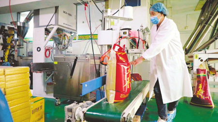 位于蔡家會(huì)鎮(zhèn)的興縣山花爛漫農(nóng)業(yè)綜合開(kāi)發(fā)有限公司,日精加工50噸谷子成套設(shè)備生產(chǎn)流水線上,經(jīng)過(guò)初篩、精選、加工、包裝后的袋裝小米經(jīng)過(guò)傳輸帶被送往庫(kù)房,等待裝車(chē)發(fā)貨?!拔覀兊漠a(chǎn)品涵蓋有機(jī)小米、綠豆、莜面、豇豆面、亞麻籽油等,年加工雜糧、油料可達(dá)4萬(wàn)多噸?!惫径麻L(zhǎng)賀虎平介紹,自2005年“山花爛漫”商標(biāo)注冊(cè)以來(lái),已與興縣50多個(gè)自然村,916戶農(nóng)戶,簽訂訂單農(nóng)業(yè)近3萬(wàn)畝,其中脫貧戶430多戶,戶均收入達(dá)到1.5萬(wàn)余元/年。