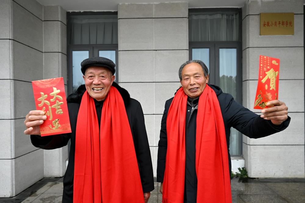 1月25日,在鳳陽(yáng)縣小崗村,“大包干”帶頭人嚴(yán)金昌(左)和嚴(yán)宏昌展示自家領(lǐng)取的分紅紅包。新華社記者 黃博涵 攝