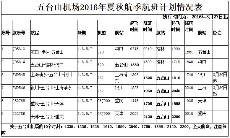 二、2016年3月27日忻州市五臺山機場執(zhí)行民航夏秋季航班時刻,每周一、三、五、日、每日五班的航班時刻,車輛運營線路和運營時間如下。