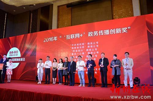 本報(bào)訊 12月22日,首屆全國(guó)互聯(lián)網(wǎng)智庫峰會(huì)暨第四屆網(wǎng)絡(luò)輿情論壇在海南省??谑新≈卣匍_。中央及各?。ㄊ?、自治區(qū))宣傳和網(wǎng)信部門領(lǐng)導(dǎo)、國(guó)內(nèi)業(yè)界知名專家、學(xué)者、政務(wù)新媒體代表等200余人齊聚一堂,圍繞“‘十三五’供給側(cè)改革背景下輿論新格局”主題,深入探討互聯(lián)網(wǎng)內(nèi)容建設(shè)與供給、政務(wù)輿情回應(yīng)和引導(dǎo)的新理念、新思路、新格局。會(huì)議期間,舉行了2016年“互聯(lián)網(wǎng)+政務(wù)傳播創(chuàng)新獎(jiǎng)”、“政務(wù)輿情回應(yīng)優(yōu)秀獎(jiǎng)”、“城市新媒體傳播優(yōu)秀獎(jiǎng)”和“全國(guó)政法新媒體建設(shè)優(yōu)秀獎(jiǎng)”頒獎(jiǎng)儀式。忻州隨手拍榮獲2016年全國(guó)“互聯(lián)網(wǎng)+政務(wù)傳播創(chuàng)新獎(jiǎng)”,為十佳之一。