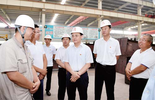 圖為省人大常委會(huì)副主任、市委書記李俊明在原平經(jīng)濟(jì)技術(shù)開發(fā)區(qū)興盛機(jī)械公司調(diào)研。(本報(bào)記者 劉紀(jì)森 攝)