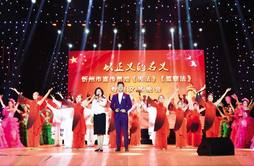 本報訊(記者康素芳 張建國)9月18日,忻州市宣傳貫徹《憲法》《監(jiān)察法》專題文藝晚會在忻州劇院匯報演出。省人大常委會副主任、市委書記李俊明,市委副書記、市長鄭連生,市政協(xié)主席劉鋼柱,市委常委、宣傳部長陳義青,市委常委、市紀(jì)委書記、市監(jiān)委主任范晉昌,市委常委、秘書長崔建新,市委常委、岢嵐縣委書記王志東,市委常委、忻州軍分區(qū)政委劉瑞生,市政協(xié)副主席邊升陽、高志偉,市檢察院檢察長周東曙,市政府秘書長郭寶厚等出席并與我市千余名黨員干部一同觀看演出。
