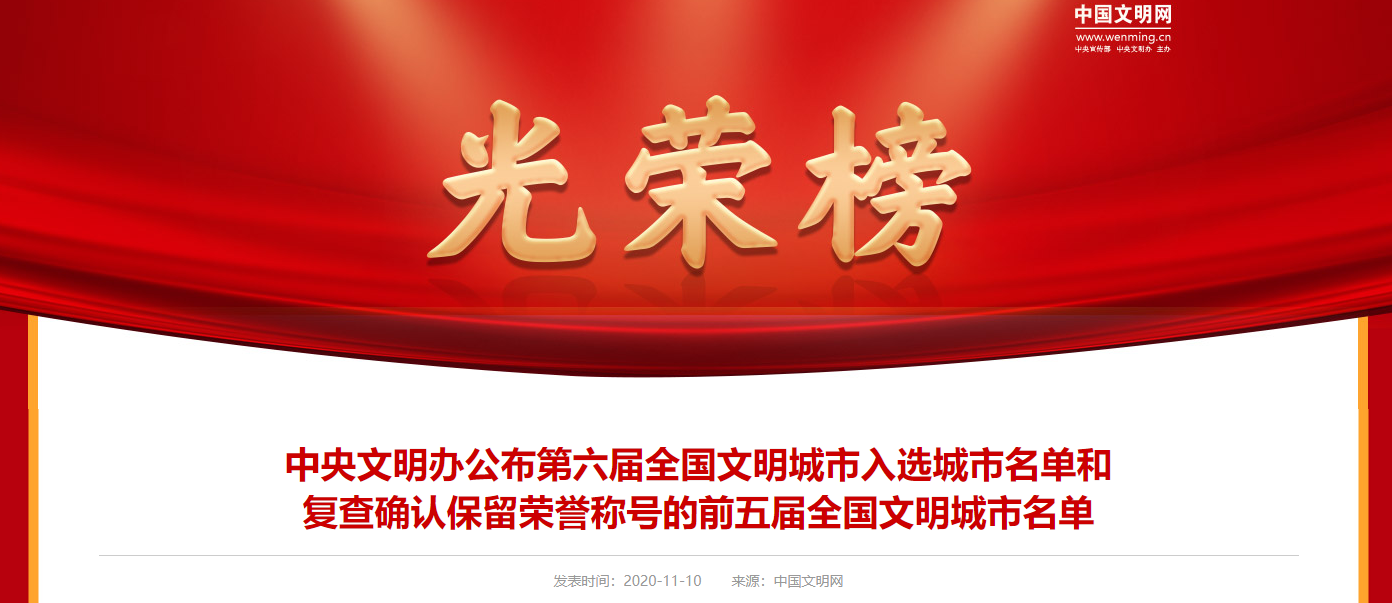 2020年8月以來,中央文明辦按照城市自主申報、省級擇優(yōu)推薦、中央部委審核、媒體集中公示、組織綜合測評、確定入選城市等評選辦法和程序,嚴謹規(guī)范組織第六屆全國文明城市評選工作,嚴格依據(jù)參評城市2018、2019、2020年三年測評總成績排名,提出第六屆全國文明城市入選城市名單,報中央文明委領導同志批準。同時,中央文明辦按照城市自查、省級審核、中央把關、組織測評等復查辦法和程序,認真做好前五屆全國文明城市復查工作,嚴格依據(jù)全國文明城市復查測評成績,提出繼續(xù)保留榮譽稱號的全國文明城市名單,報中央文明委領導同志批準?,F(xiàn)將第六屆全國文明城市入選城市名單和復查確認保留榮譽稱號的前五屆全國文明城市名單公布如下。