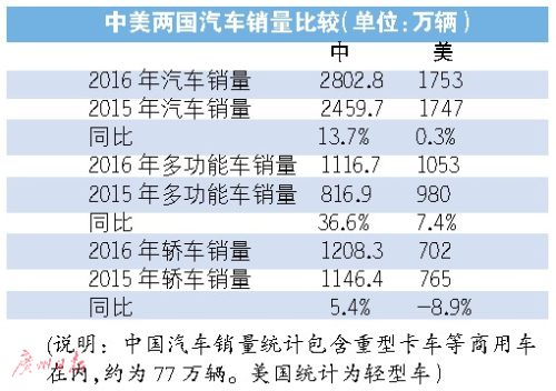 不被看好的2016年車市,在上半年“低開”之后,硬是憑借下半年的“高走”,實(shí)現(xiàn)全年逆襲。2016年,中國車市交出漂亮成績單,全年產(chǎn)銷分別完成2811.9萬輛和2802.8萬輛,比上年同期分別增長14.5%和13.7%,高于上年同期11.2和9.0個百分點(diǎn)。這一成績單,讓中國車市毫無懸念蟬聯(lián)全球第一大市場寶座,并再創(chuàng)歷史新高,自2009年超越美國成為全球第一大市場之后,中國再未讓這頭銜旁落。2016年,盡管美國市場創(chuàng)出1753萬輛的新高,但與中國差距已經(jīng)拉大至1049萬輛。
