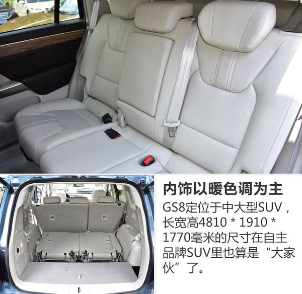 GS8的設(shè)計(jì)由原奔馳設(shè)計(jì)師張帆操刀,在內(nèi)飾部分也較為洞察國內(nèi)消費(fèi)者的喜好。車內(nèi)整體寬敞舒適,顏色采用偏暖的木色,打造一種家用溫馨感??臻g方面,GS8的長(zhǎng)寬高分別為4810*1910*1770毫米,軸距2800毫米,采用7座布局。