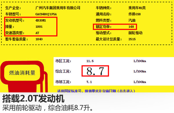 動(dòng)力方面,從國家工信部公布的信息可知,廣汽傳祺GS8將搭載一臺(tái)型號(hào)為4B20M1的2.0升直列四缸渦輪增壓發(fā)動(dòng)機(jī),額定功率148千瓦,匹配6速自動(dòng)變速箱。百公里綜合油耗分別為:兩驅(qū)車型8.7升,四驅(qū)車型9.3升。