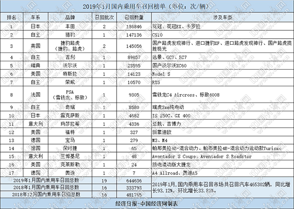 根據國家市場監(jiān)督管理總局缺陷產品管理中心1月份發(fā)布的召回公告,經濟日報-中國經濟網汽車頻道經過匯總、統計,整理出“2019年1月國內乘用車召回榜單”。1月,國內乘用車市場發(fā)布19起召回公告,共涉及19個品牌的644636輛汽車,同比增長93.12%,環(huán)比增長33.81%。