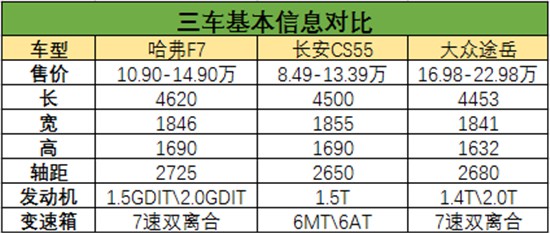 動(dòng)力部分,途岳提供了1.4T+2.0T的發(fā)動(dòng)機(jī)可供選擇,其中,1.4T發(fā)動(dòng)機(jī)的最大馬力為150匹,峰值扭矩250N.m;2.0T發(fā)動(dòng)機(jī)的最大馬力為186匹,峰值扭矩320 N.m,傳動(dòng)方面,兩款發(fā)動(dòng)機(jī)均匹配的是7速雙離合變速箱。單就動(dòng)力參數(shù)來(lái)看,很明顯,今天推薦的三款車中,哈弗F7優(yōu)勢(shì)最大,途岳次之。但同樣拿出頂配的2.0T車型對(duì)比,途岳不僅配置不如哈弗F7,售價(jià)也要高上小十萬(wàn)元。