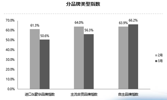 從庫(kù)存預(yù)警指數(shù)各分區(qū)表現(xiàn)來(lái)看,北區(qū)指數(shù)為51.3%,東區(qū)指數(shù)為55.4%,南區(qū)指數(shù)為57.4%,西區(qū)指數(shù)為60.8%。北區(qū)指數(shù)趨于預(yù)警線,當(dāng)?shù)亟?jīng)銷商面臨經(jīng)營(yíng)壓力相對(duì)較低。 品牌方面,進(jìn)口&豪華品牌、合資品牌指數(shù)較上月有所下降;自主品牌指數(shù)則居高不下。郎學(xué)紅表示,雖然庫(kù)存預(yù)警指數(shù)整體較高,但是進(jìn)口&豪華品牌已經(jīng)接近臨界值,品牌分化現(xiàn)象變得愈加明顯。