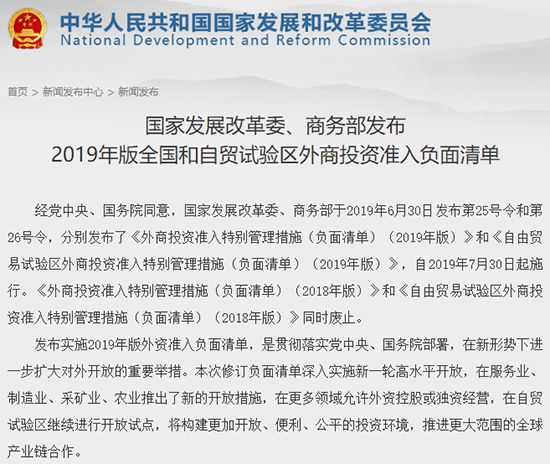 昨日,國家發(fā)展改革委、商務(wù)部連續(xù)發(fā)布了第25號(hào)令、第26號(hào)令和第27號(hào)令,分別發(fā)布了《外商投資準(zhǔn)入特別管理措施(負(fù)面清單)(2019年版)》(以下簡稱《外資準(zhǔn)入負(fù)面清單》)、《自由貿(mào)易試驗(yàn)區(qū)外商投資準(zhǔn)入特別管理措施(負(fù)面清單)(2019年版)》(以下簡稱《自貿(mào)試驗(yàn)區(qū)負(fù)面清單》)以及《鼓勵(lì)外商投資產(chǎn)業(yè)目錄(2019年版)》(以下簡稱《外商投資目錄》)。