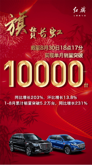 2019年8月30日18點(diǎn)17分,據(jù)紅旗官宣,紅旗品牌單月銷量已突破10000輛,同比增長203%,環(huán)比增長13.8%,至此,1-8月累計實(shí)現(xiàn)銷量5.2萬輛,同比增長231%。單月突破10000輛的成績,使紅旗首次躋身月銷萬輛俱樂部,這一極具里程碑意義的銷量數(shù)字,讓紅旗進(jìn)入了主流豪華品牌陣營,書寫了紅旗誕生61年來新的紀(jì)錄,也驗(yàn)證了紅旗正以氣貫長虹的勇猛之勢,實(shí)現(xiàn)著全方位的“跨越”。