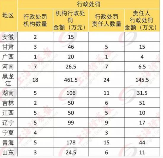 處罰機(jī)構(gòu)5個以上的地區(qū)有:黑龍江(處罰機(jī)構(gòu)18個,對機(jī)構(gòu)罰款合計461.5萬元;處罰責(zé)任人24個,對責(zé)任人罰款合計145.5萬元);重慶(處罰機(jī)構(gòu)10個,對機(jī)構(gòu)罰款合計348萬元;處罰責(zé)任人15個,對責(zé)任人罰款合計131萬元)。