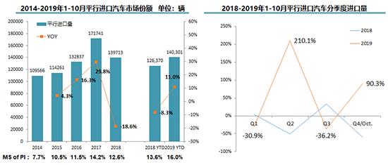 相比之下,平行進(jìn)口市場則實(shí)現(xiàn)逆勢上揚(yáng)。1-10月,平行進(jìn)口汽車?yán)塾嬤M(jìn)口14.0萬輛,同比增長11.0%,占進(jìn)口總量的16.0%,創(chuàng)歷史新高。流通協(xié)會認(rèn)為,這主要是受國六實(shí)施等政策的影響。