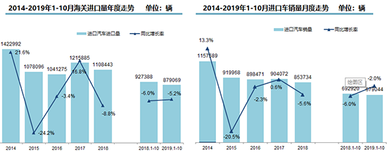 同比微降2.0%,降幅相比2018年收窄3.6個百分點(diǎn)。其中,受2018年關(guān)稅稅率下調(diào)和國六實(shí)施影響,進(jìn)口車銷量大起大落,在二季度增長22.1%之后,市場再次進(jìn)入下行通道。