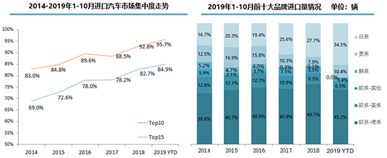 隨著品牌結(jié)構(gòu)的深度調(diào)整,進(jìn)口車市場品牌集中度持續(xù)提高。1-10月,進(jìn)口車前十大品牌占比達(dá)到84.9%,其中歐系品牌依然是絕對主力,德系占比達(dá)到45.2%,位居所有國別的第一位,但市場份額明顯下滑;作為第二大系別,日系在豐田、雷克薩斯的拉動下,份額大幅提升至34.5%,較去年提高6.8個百分點(diǎn)。此外,美系品牌市場份額回升至10.4%,韓系品牌則徹底退出進(jìn)口車市場。