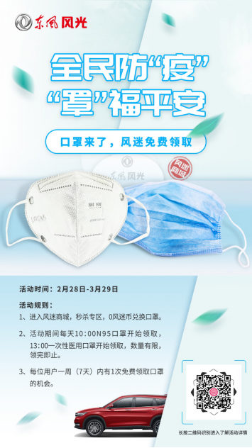 針對疫情期間“一罩難求”的問題,東風(fēng)小康公司推出了“萬只口罩限量免費(fèi)領(lǐng)取”活動,從現(xiàn)在至3月29日,風(fēng)迷商城將每天免費(fèi)送出100份N95、一次性醫(yī)用口罩,為用戶獻(xiàn)上專屬關(guān)愛。