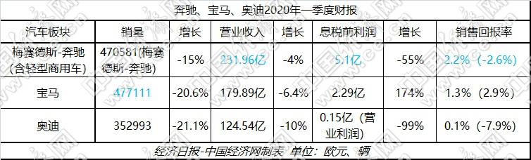 在疫情影響下,一季度BBA汽車業(yè)務(wù),除寶馬因去年同期“特別項(xiàng)目”導(dǎo)致基數(shù)較低,個(gè)別財(cái)務(wù)指標(biāo)實(shí)現(xiàn)正增長外,BBA各主要財(cái)務(wù)指標(biāo)均出現(xiàn)下滑。對(duì)比來看,寶馬以近48萬輛繼續(xù)在銷量上保持引領(lǐng);奔馳在營業(yè)收入、息稅前利潤、銷售回報(bào)率上實(shí)現(xiàn)領(lǐng)先;奧迪方面則依然墊底BBA。