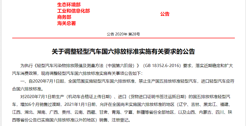 關(guān)于調(diào)整輕型汽車國(guó)六排放標(biāo)準(zhǔn)實(shí)施有關(guān)要求的公告