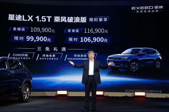 奇瑞汽車股份有限公司黨委書記、董事長尹同躍現場宣布了一項“長期福利”:即日起至10月31日,星途LX 1.5T乘風破浪版限時售價9.99萬元起、還可享CN95空濾免費升級、首任車主基礎流量終身免費、首任車主發(fā)動機及變速箱核心零部件終身質?!叭舛Y包”。