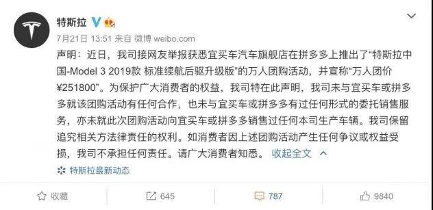特斯拉在微博上對(duì)于拼多多“團(tuán)購(gòu)”的聲明截圖。 然而在該活動(dòng)上線同日,特斯拉在微博發(fā)布官方聲明,稱(chēng)接網(wǎng)友舉報(bào)獲悉了宜買(mǎi)車(chē)汽車(chē)旗艦店在拼多多上推出的萬(wàn)人團(tuán)購(gòu)活動(dòng),并稱(chēng):“我司特在此聲明,我司未與宜買(mǎi)車(chē)或拼多多就該團(tuán)購(gòu)有任何合作,也未與宜買(mǎi)車(chē)或拼多多有任何形式的委托銷(xiāo)售服務(wù),亦未就此次團(tuán)購(gòu)活動(dòng)向宜買(mǎi)車(chē)或拼多多銷(xiāo)售過(guò)任何本司生產(chǎn)車(chē)輛。我司保留追究相關(guān)法律責(zé)任的權(quán)利。如消費(fèi)者因尚上述團(tuán)購(gòu)活動(dòng)產(chǎn)生任何爭(zhēng)議或權(quán)益受損,我司不承擔(dān)任何責(zé)任。請(qǐng)廣大消費(fèi)者知悉。” 來(lái)自特斯拉的這一官方聲明,表明了這場(chǎng)團(tuán)購(gòu)并非特斯拉主動(dòng)參與其中。然而事情并沒(méi)有到此結(jié)束。 8月14日,一位來(lái)自武漢的購(gòu)車(chē)人稱(chēng),其通過(guò)拼多多網(wǎng)購(gòu)平臺(tái)購(gòu)買(mǎi)的國(guó)產(chǎn)Model 3被特斯拉拒絕交付。在這位購(gòu)車(chē)人提供的信息中,特斯拉交付專(zhuān)員以“我司懷疑此訂單為拼多多或其他商家以您的名義下單。實(shí)際上構(gòu)成向我司隱瞞真實(shí)下單信息,我司此前公告已經(jīng)聲明拼多多的該團(tuán)購(gòu)活動(dòng)未經(jīng)授權(quán),您應(yīng)當(dāng)向付款購(gòu)車(chē)的商家要求交付車(chē)輛或者退款”。 根據(jù)上述車(chē)主公開(kāi)的轉(zhuǎn)賬電子回單顯示,其向特斯拉汽車(chē)銷(xiāo)售服務(wù)(武漢)有限公司轉(zhuǎn)賬了27.055萬(wàn)元(之前已預(yù)交1000元訂金),并提出“我個(gè)人信息下單買(mǎi)的車(chē),你們也收到錢(qián),怎么就算欺騙?” 特斯拉交付專(zhuān)員表示,拼多多和宜買(mǎi)車(chē)的行為,違反了特斯拉汽車(chē)訂購(gòu)條款中明確約定的禁止轉(zhuǎn)賣(mài)條款,并勸告該武漢車(chē)主通過(guò)特斯拉官方渠道下訂單。 據(jù)悉,在特斯拉“禁止轉(zhuǎn)賣(mài)”條款中,強(qiáng)調(diào)特斯拉直接面向客戶銷(xiāo)售汽車(chē)。“對(duì)于任何和我司認(rèn)為其目的是為了轉(zhuǎn)賣(mài)的訂單或者其他非善意目的的訂單,我司有權(quán)單方面解除本協(xié)議?!碧厮估?fù)責(zé)人指出,“特斯拉中國(guó)曾在多個(gè)渠道公開(kāi)明確表示,特斯拉官方網(wǎng)站為新車(chē)唯一正規(guī)購(gòu)買(mǎi)渠道,且從未委托其他平臺(tái)或商家進(jìn)行銷(xiāo)售活動(dòng)?!?/span> 直銷(xiāo)模式價(jià)格調(diào)整成家常便飯 特斯拉:為了消費(fèi)者好 與傳統(tǒng)汽車(chē)廠商不同,特斯拉在銷(xiāo)售網(wǎng)絡(luò)布局上并沒(méi)有采用授權(quán)經(jīng)銷(xiāo)商模式,而是采用了“廠家直銷(xiāo)”。此次拼多多團(tuán)購(gòu)不被特斯拉“允許”,與其直銷(xiāo)模式產(chǎn)生了直接沖突有一定關(guān)聯(lián)。