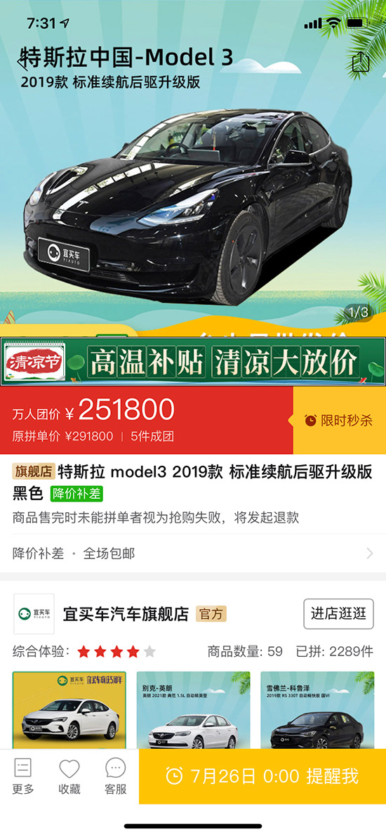 拼多多“團(tuán)購(gòu)”特斯拉活動(dòng)頁(yè)面截圖。 今年7月21日,連鎖汽車(chē)銷(xiāo)售平臺(tái)宜買(mǎi)車(chē)聯(lián)合拼多多推出了一場(chǎng)特斯拉萬(wàn)人團(tuán)購(gòu)活動(dòng)。活動(dòng)期間,特斯拉官方指導(dǎo)價(jià)為27.155萬(wàn)元的特斯拉Model 3 標(biāo)準(zhǔn)續(xù)航后輪驅(qū)動(dòng)升級(jí)版 ,在拼多多平臺(tái)上的團(tuán)購(gòu)價(jià)為每臺(tái)25.18萬(wàn)元,團(tuán)購(gòu)價(jià)格比官方售價(jià)便宜了近2萬(wàn)元。 活動(dòng)上線后,引發(fā)了超過(guò)3萬(wàn)人報(bào)名參與,而最終能得到“團(tuán)購(gòu)價(jià)”的僅有5個(gè)名額。