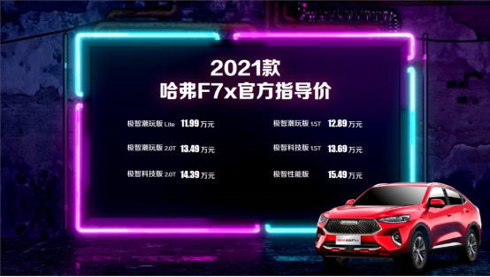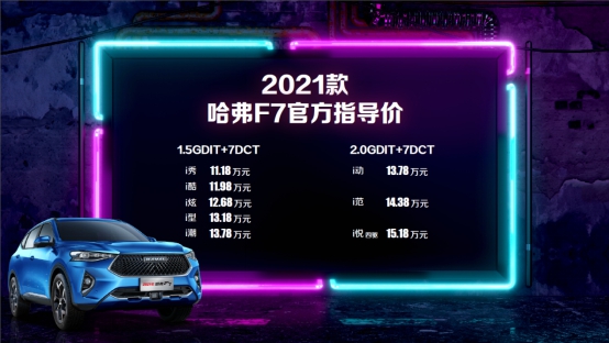 2021款哈弗F7共發(fā)布包括i秀、i酷以及i潮等8個(gè)版本,廠商指導(dǎo)價(jià)區(qū)間為11.18萬(wàn)元——15.18萬(wàn)元;2021款哈弗F7x上市發(fā)布共計(jì)6個(gè)版本,廠商指導(dǎo)價(jià)區(qū)間為11.99萬(wàn)元——15.49萬(wàn)元。為讓更多用戶共享出行智慧生活,2021款哈弗F7/F7x同步通過“五大上新”以及“Fun-Life 2.0系統(tǒng)”和“12.3寸中控顯示大屏”兩大全系標(biāo)配,實(shí)現(xiàn)智能化再進(jìn)階。