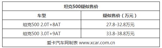 此次曝光的疑似售價(jià)中,還曝光了坦克500將搭載2.0T+8AT變速箱車型,這一點(diǎn)與此前的消息不太吻合。此前曝光,坦克500將搭載長(zhǎng)城最新的3.0T+9AT變速箱,疑似售價(jià)為33.8-38.8萬(wàn)元。而2.0T+8AT車型的推出更多的是降低坦克500車系的售價(jià),將其起售價(jià)下降至30萬(wàn)元以內(nèi),哈弗H9已經(jīng)迎來(lái)的中期改款,售價(jià)為21.48-37.98萬(wàn)元,同樣搭載了2.0T+8AT動(dòng)力,如果動(dòng)力相同哈弗H9不香嗎?