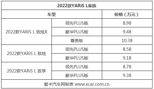 近日,我們從廣汽豐田官方獲悉,2022款YARiS L家族正式上市,其中YARiS L 致炫X提供3款車型,指導(dǎo)價(jià)格為8.98-10.38萬(wàn)元;YARiS L 致炫提供兩款車型,指導(dǎo)價(jià)格為8.58-9.18萬(wàn)元;YARiS L 致享提供2款車型,指導(dǎo)價(jià)格為8.78-9.38萬(wàn)元。