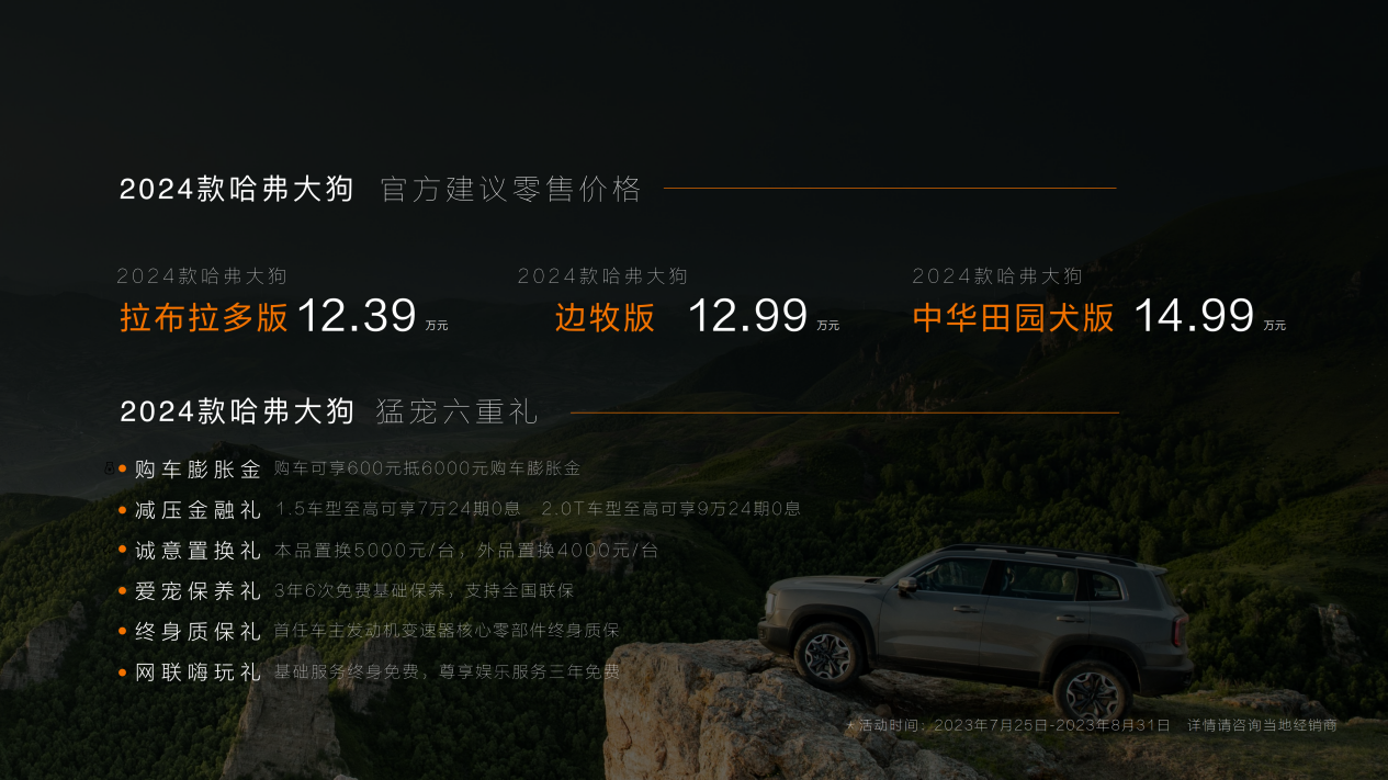 央廣網(wǎng)北京7月26日消息,昨天2024款哈弗大狗正式上市,新車共推出三款車型。2024款哈弗大狗不斷超越自我,在外觀、動(dòng)力、智能等方面的全面進(jìn)階,旨在強(qiáng)勢接力輕越野引領(lǐng)者的產(chǎn)品使命,在穩(wěn)固輕越野賽道產(chǎn)品地位的同時(shí),不斷征服更為廣闊的市場藍(lán)海。