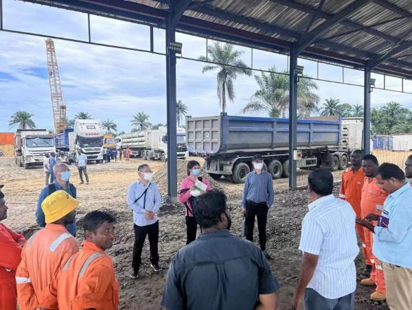東風(fēng)人員在尼日利亞CNG牽引車工地現(xiàn)場(chǎng)與客戶交流