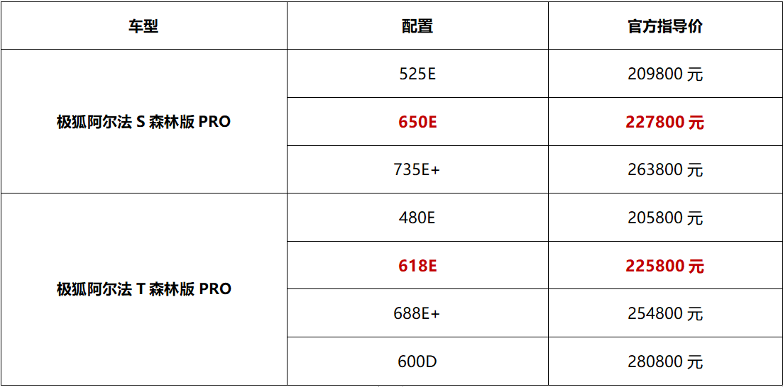 1月25日,極狐汽車旗下阿爾法S/T森林版PRO整體在原森林版基礎(chǔ)上,圍繞前后排座椅加熱/按摩、真皮方向盤、熱泵空調(diào)等豪華、舒適性配置進(jìn)行多維升級,同時還新增了阿爾法S森林版PRO 650E、阿爾法T森林版PRO 618E,官方指導(dǎo)價分別為22.78萬元、22.58萬元。
