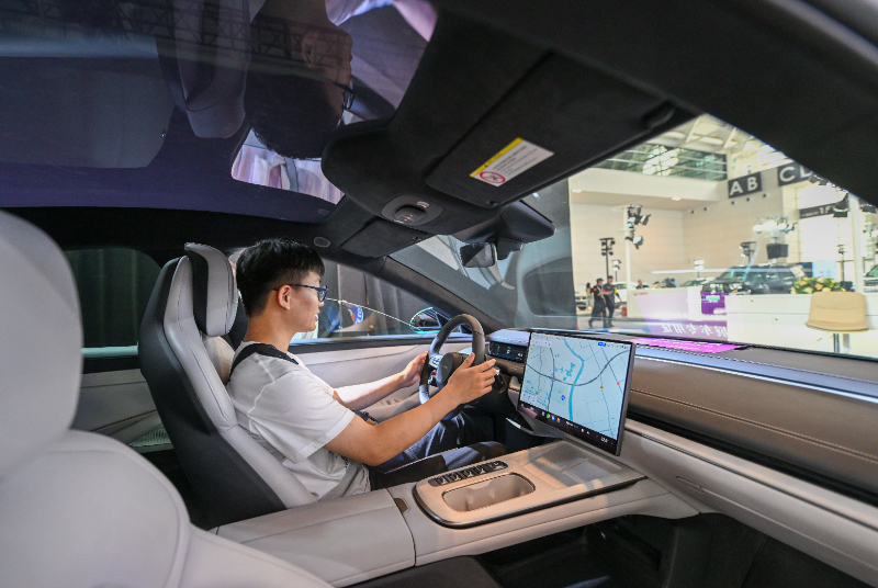 觀眾在2024世界智能產(chǎn)業(yè)博覽會(huì)現(xiàn)場靜態(tài)體驗(yàn)一款智能網(wǎng)聯(lián)電動(dòng)汽車(6月22日攝)。新華社記者 孫凡越 攝