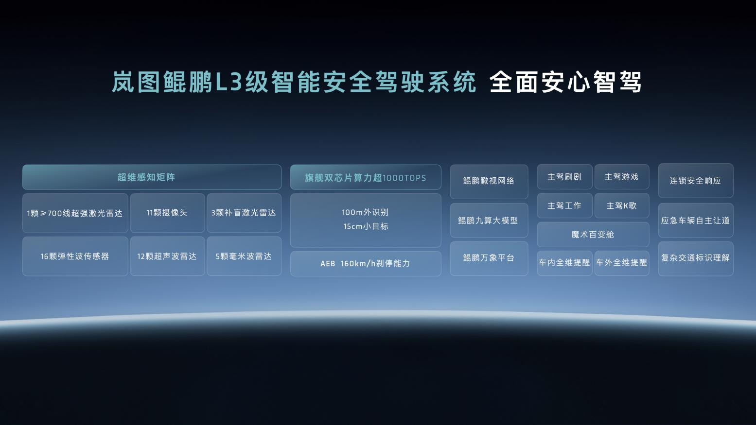 嵐圖鯤鵬L3級智能安全駕駛系統(tǒng) 引領(lǐng)智駕安全新高度 嵐圖汽車通過系統(tǒng)的創(chuàng)新,全面擁抱高階智駕技術(shù),為用戶帶來更安全、更智能的駕駛體驗。在智駕安全方面,鯤鵬智駕L3級智能安全駕駛系統(tǒng)實(shí)現(xiàn)了更安全的識別與更高的智駕安全帶寬。對于一個15cm的小物體,具備L3級智駕的技術(shù)能力,可在100m外識別;AEB剎停速度方面,具備L3智駕的技術(shù)能力可以在160km/h剎停。 鯤鵬智駕L3級智能安全駕駛系統(tǒng),以超700線數(shù)的激光雷達(dá)打造感知最強(qiáng),以超1000TOPS的雙旗艦芯片打造算力最強(qiáng),以最新一代的數(shù)智融合平臺實(shí)現(xiàn)決策最強(qiáng)進(jìn)化,不斷拉高安全的上限,守護(hù)用戶智駕的體驗。讓智駕更安全,讓用戶安心去駕,放心智駕。