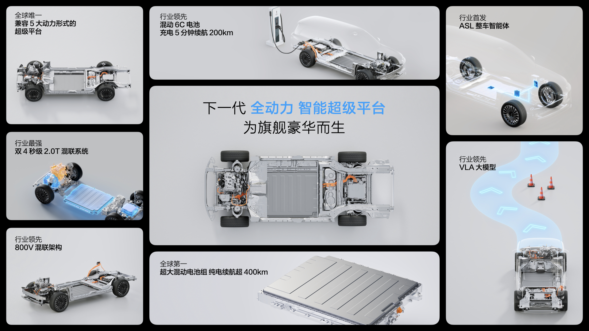 該平臺具備七大領(lǐng)先優(yōu)勢,分別是,兼容5大動力形式的超級平臺;雙4s(秒)級2.0T超級混聯(lián)系統(tǒng);800V混聯(lián)架構(gòu);超大混動電池組,純電續(xù)航超400km;混動6C電池,充電5分鐘續(xù)航200km;行業(yè)首發(fā)的整車智能體以及行業(yè)領(lǐng)先的VLA大模型、