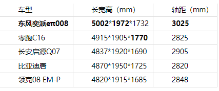 家庭出游的核心訴求是“全員舒適”,空間表現(xiàn)直接影響乘坐體驗。在這一點上,東風(fēng)奕派eπ008交出了亮眼答卷,超5米的車長(5002mm)與超3米的軸距(3025mm)全面碾壓同級競品。五款車型中,東風(fēng)奕派eπ008是唯一一款車長超過5米、軸距超過3米的車型。更高級別的車長和軸距,帶來了更充裕的縱向空間,確保每位乘客皆可舒展身姿,盡享愜意旅途。