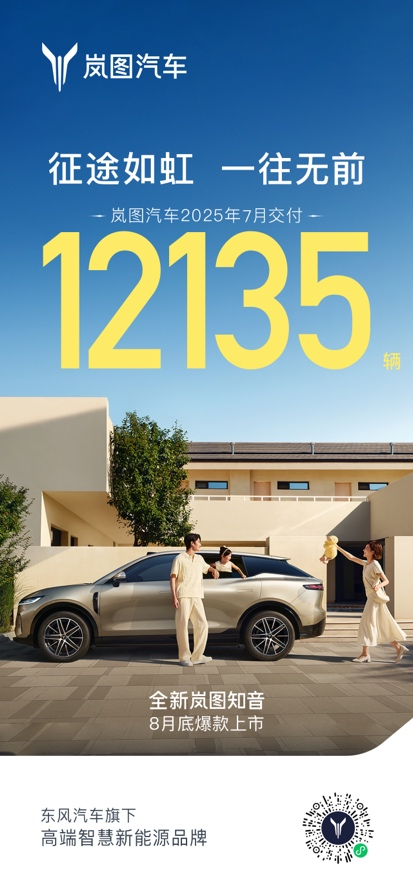 嵐圖汽車CEO盧放表示:“在用戶的支持下,嵐圖汽車7月延續(xù)高質(zhì)量發(fā)展態(tài)勢,嵐圖夢想家穩(wěn)居銷量冠軍,全新上市的嵐圖FREE+也快速獲得市場認可,這進一步堅定了我們的發(fā)展信心。8月,我們將更進一步提速生產(chǎn)交付、升級服務體驗、加強用戶交流,并推出新產(chǎn)品——全新嵐圖知音,為用戶帶來更多優(yōu)質(zhì)選擇,為品牌發(fā)展注入更強動能。”