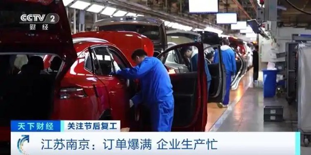 在南京市江北新區(qū)的一家大型汽車生產(chǎn)企業(yè),其中一個(gè)車間面積4萬(wàn)平方米,產(chǎn)線從腳下延伸到了頭頂,工作人員正在緊張忙碌著,一輛輛嶄新的汽車高效地走向流水線。這里每天可以生產(chǎn)汽車1000輛左右。一些剛剛上市的新款新能源汽車產(chǎn)品,銷售非常火爆,訂單已經(jīng)排到了今年下半年。正月初五這里已經(jīng)全員在崗趕訂單。這個(gè)車間,每天兩個(gè)班組,1200多名工人日夜在崗,這個(gè)數(shù)字是去年春節(jié)同期的2.5倍。