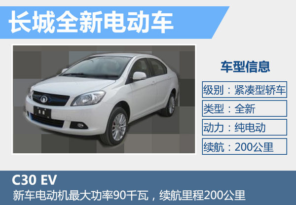 根據(jù)長(zhǎng)城汽車此前公布消息,旗下首款純電動(dòng)轎車將于2016年上市。網(wǎng)通社獲得了一組長(zhǎng)城全新電動(dòng)車型C30 EV的諜照及部分信息,新車外觀方面較燃油版車型在細(xì)節(jié)方面進(jìn)行調(diào)整,加入更多“EV”元素。新車搭載一臺(tái)功率為90千瓦的電動(dòng)機(jī),續(xù)航里程有望達(dá)到200公里。