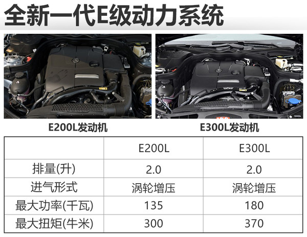 動力方面,新車將搭載兩款不同調(diào)校的2.0T渦輪增壓發(fā)動機(jī),其中E200L是沿用現(xiàn)款車型上的2.0T發(fā)動機(jī),最大功率135千瓦,最大扭計300牛米;E300L發(fā)動機(jī)則擁有更強(qiáng)的動力,最大功率180千瓦,最大扭矩達(dá)到370牛米。