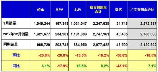 2018年1月我國(guó)狹義乘用車(chē)銷(xiāo)量為2247639輛,同比增長(zhǎng)8.2%,環(huán)比下滑18.2%。崔東樹(shù)認(rèn)為,今年1月份沒(méi)有處于春節(jié)假期之中,有效銷(xiāo)售日有所增加,因此汽車(chē)銷(xiāo)量出現(xiàn)小幅增長(zhǎng)。