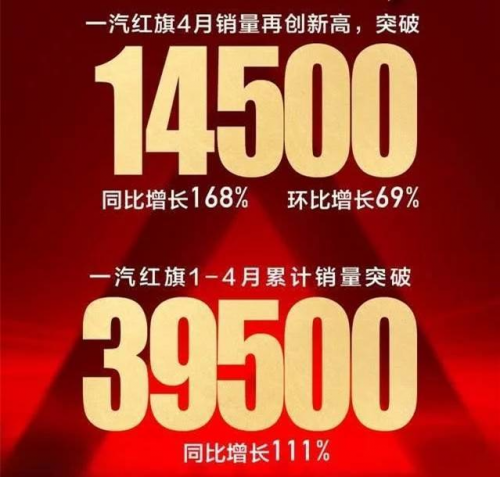 2019年,紅旗品牌累計(jì)銷量突破100000輛大關(guān),同比增長(zhǎng)200%以上,銷量目標(biāo)比計(jì)劃提前了整整一年。然而,今年年初,一場(chǎng)突如其來(lái)的疫情,給全球汽車產(chǎn)業(yè)帶來(lái)了巨大的沖擊,大部分車企品牌銷量陷入一片下滑之中,而一汽紅旗卻逆勢(shì)而上,實(shí)現(xiàn)了超高增長(zhǎng)。數(shù)據(jù)顯示,紅旗品牌4月份銷量14500輛,同比增長(zhǎng)168%,環(huán)比增長(zhǎng)69%;1—4月累積銷量突破39500輛,同比增長(zhǎng)111%。
