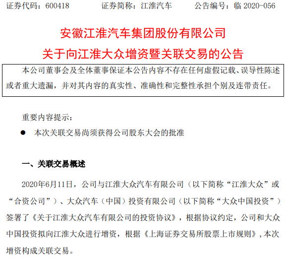 江淮汽車方面表示,“本次增資系公司和大眾中國投資戰(zhàn)略合作中的重要環(huán)節(jié),本次增資有利于推進公司和大眾中國投資的戰(zhàn)略合作,有利于促進合資公司的發(fā)展。”