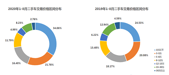 1-8月,全國二手車市場累計交易量811.47萬輛,同比下降12.50%。其中,3萬元及以下價格區(qū)間的車輛增長9.53%;3-5萬區(qū)間增長1.70%;5-8萬區(qū)間下降1.76%;8-12萬區(qū)間下降1.69%;12-15萬區(qū)間下降1.23%;15-30萬區(qū)間下降4.71%;30萬區(qū)間以上下降1.83%。