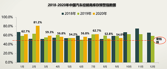 即便處于汽車市場的“金九”旺季,經(jīng)銷商的庫存壓力依然不小。昨日(10月13日),流通協(xié)會發(fā)布數(shù)據(jù)顯示,9月,國內(nèi)汽車經(jīng)銷商庫存預(yù)警指數(shù)為54.0%,較上月上升1.2個百分點,較去年同期下降4.6個百分點,庫存預(yù)警指數(shù)位于榮枯線之上。