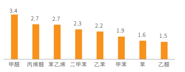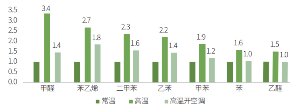 高溫模式下的揮發(fā)性有機(jī)物測(cè)評(píng)結(jié)果不如人意,濃度平均為常溫下的2倍。甲醛、乙醛、二甲苯和苯乙烯分別為常溫模式的3.8倍、1.5倍、2.3倍和2.7倍。由此可見,消費(fèi)者“溫度越高,車?yán)镂兜涝酱蟆钡臉闼馗兄c測(cè)試結(jié)果相符,高溫下的車內(nèi)污染問題亟待解決。?