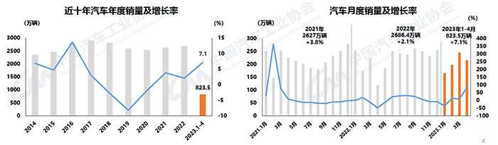 中汽協(xié)數(shù)據(jù)顯示,1-4月,汽車產(chǎn)銷分別完成835.5萬輛和823.5萬輛,同比分別增長8.6%和7.1%。4月,汽車產(chǎn)銷分別完成213.3萬輛和215.9萬輛,環(huán)比分別下降17.5%和11.9%,同比分別增長76.8%和82.7%。